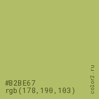 Цвет #B2BE67 в цветовой модели RGB обозначается тремя октетами (178, 190, 103) в десятичном формате и #B2BE67 в шестнадцатиричном (hex) формате, которые являются интенсивностью красного 178 (hex B2), интенсивность зелёного 190 (hex BE) и интенсивность синего 103 (hex 67).