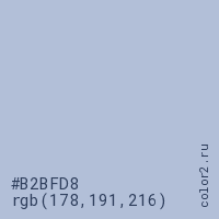 Цвет #B2BFD8 в цветовой модели RGB обозначается тремя октетами (178, 191, 216) в десятичном формате и #B2BFD8 в шестнадцатиричном (hex) формате, которые являются интенсивностью красного 178 (hex B2), интенсивность зелёного 191 (hex BF) и интенсивность синего 216 (hex D8).