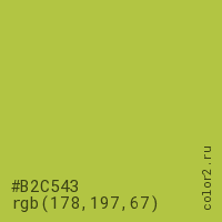Цвет #B2C543 в цветовой модели RGB обозначается тремя октетами (178, 197, 67) в десятичном формате и #B2C543 в шестнадцатиричном (hex) формате, которые являются интенсивностью красного 178 (hex B2), интенсивность зелёного 197 (hex C5) и интенсивность синего 67 (hex 43).