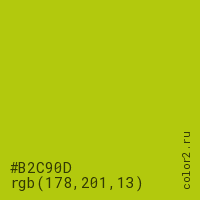 Цвет #B2C90D в цветовой модели RGB обозначается тремя октетами (178, 201, 13) в десятичном формате и #B2C90D в шестнадцатиричном (hex) формате, которые являются интенсивностью красного 178 (hex B2), интенсивность зелёного 201 (hex C9) и интенсивность синего 13 (hex 0D).