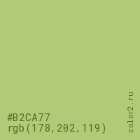 Цвет #B2CA77 в цветовой модели RGB обозначается тремя октетами (178, 202, 119) в десятичном формате и #B2CA77 в шестнадцатиричном (hex) формате, которые являются интенсивностью красного 178 (hex B2), интенсивность зелёного 202 (hex CA) и интенсивность синего 119 (hex 77).