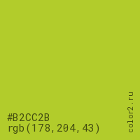 Цвет #B2CC2B в цветовой модели RGB обозначается тремя октетами (178, 204, 43) в десятичном формате и #B2CC2B в шестнадцатиричном (hex) формате, которые являются интенсивностью красного 178 (hex B2), интенсивность зелёного 204 (hex CC) и интенсивность синего 43 (hex 2B).