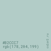 Цвет #B2CCC7 в цветовой модели RGB обозначается тремя октетами (178, 204, 199) в десятичном формате и #B2CCC7 в шестнадцатиричном (hex) формате, которые являются интенсивностью красного 178 (hex B2), интенсивность зелёного 204 (hex CC) и интенсивность синего 199 (hex C7).