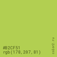 Цвет #B2CF51 в цветовой модели RGB обозначается тремя октетами (178, 207, 81) в десятичном формате и #B2CF51 в шестнадцатиричном (hex) формате, которые являются интенсивностью красного 178 (hex B2), интенсивность зелёного 207 (hex CF) и интенсивность синего 81 (hex 51).