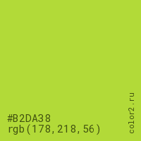 Цвет #B2DA38 в цветовой модели RGB обозначается тремя октетами (178, 218, 56) в десятичном формате и #B2DA38 в шестнадцатиричном (hex) формате, которые являются интенсивностью красного 178 (hex B2), интенсивность зелёного 218 (hex DA) и интенсивность синего 56 (hex 38).