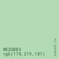 Цвет #B2DBB5 в цветовой модели RGB обозначается тремя октетами (178, 219, 181) в десятичном формате и #B2DBB5 в шестнадцатиричном (hex) формате, которые являются интенсивностью красного 178 (hex B2), интенсивность зелёного 219 (hex DB) и интенсивность синего 181 (hex B5).