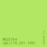 Цвет #B2E764 в цветовой модели RGB обозначается тремя октетами (178, 231, 100) в десятичном формате и #B2E764 в шестнадцатиричном (hex) формате, которые являются интенсивностью красного 178 (hex B2), интенсивность зелёного 231 (hex E7) и интенсивность синего 100 (hex 64).