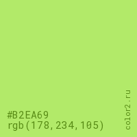 Цвет #B2EA69 в цветовой модели RGB обозначается тремя октетами (178, 234, 105) в десятичном формате и #B2EA69 в шестнадцатиричном (hex) формате, которые являются интенсивностью красного 178 (hex B2), интенсивность зелёного 234 (hex EA) и интенсивность синего 105 (hex 69).