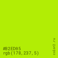 Цвет #B2ED05 в цветовой модели RGB обозначается тремя октетами (178, 237, 5) в десятичном формате и #B2ED05 в шестнадцатиричном (hex) формате, которые являются интенсивностью красного 178 (hex B2), интенсивность зелёного 237 (hex ED) и интенсивность синего 5 (hex 05).