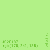 Цвет #B2F187 в цветовой модели RGB обозначается тремя октетами (178, 241, 135) в десятичном формате и #B2F187 в шестнадцатиричном (hex) формате, которые являются интенсивностью красного 178 (hex B2), интенсивность зелёного 241 (hex F1) и интенсивность синего 135 (hex 87).
