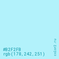 Цвет RGB(178, 242, 251) в процентом отношении количества цвета состоит из 69.8% красного (red), 94.9% зелёного (green) и 98.4% синего (blue).