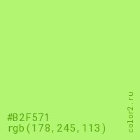 Цвет #B2F571 в цветовой модели RGB обозначается тремя октетами (178, 245, 113) в десятичном формате и #B2F571 в шестнадцатиричном (hex) формате, которые являются интенсивностью красного 178 (hex B2), интенсивность зелёного 245 (hex F5) и интенсивность синего 113 (hex 71).