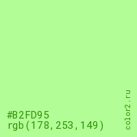 Цвет #B2FD95 в цветовой модели RGB обозначается тремя октетами (178, 253, 149) в десятичном формате и #B2FD95 в шестнадцатиричном (hex) формате, которые являются интенсивностью красного 178 (hex B2), интенсивность зелёного 253 (hex FD) и интенсивность синего 149 (hex 95).