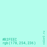 Цвет #B2FEEC в цветовой модели RGB обозначается тремя октетами (178, 254, 236) в десятичном формате и #B2FEEC в шестнадцатиричном (hex) формате, которые являются интенсивностью красного 178 (hex B2), интенсивность зелёного 254 (hex FE) и интенсивность синего 236 (hex EC).