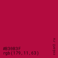Цвет #B30B3F в цветовой модели RGB обозначается тремя октетами (179, 11, 63) в десятичном формате и #B30B3F в шестнадцатиричном (hex) формате, которые являются интенсивностью красного 179 (hex B3), интенсивность зелёного 11 (hex 0B) и интенсивность синего 63 (hex 3F).