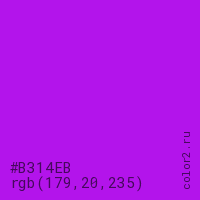 Цвет #B314EB в цветовой модели RGB обозначается тремя октетами (179, 20, 235) в десятичном формате и #B314EB в шестнадцатиричном (hex) формате, которые являются интенсивностью красного 179 (hex B3), интенсивность зелёного 20 (hex 14) и интенсивность синего 235 (hex EB).