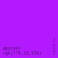Цвет #B319FF в цветовой модели RGB обозначается тремя октетами (179, 25, 255) в десятичном формате и #B319FF в шестнадцатиричном (hex) формате, которые являются интенсивностью красного 179 (hex B3), интенсивность зелёного 25 (hex 19) и интенсивность синего 255 (hex FF).