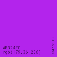 Цвет #B324EC в цветовой модели RGB обозначается тремя октетами (179, 36, 236) в десятичном формате и #B324EC в шестнадцатиричном (hex) формате, которые являются интенсивностью красного 179 (hex B3), интенсивность зелёного 36 (hex 24) и интенсивность синего 236 (hex EC).