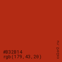 Цвет #B32B14 в цветовой модели RGB обозначается тремя октетами (179, 43, 20) в десятичном формате и #B32B14 в шестнадцатиричном (hex) формате, которые являются интенсивностью красного 179 (hex B3), интенсивность зелёного 43 (hex 2B) и интенсивность синего 20 (hex 14).