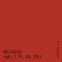 Цвет #B33026 в цветовой модели RGB обозначается тремя октетами (179, 48, 38) в десятичном формате и #B33026 в шестнадцатиричном (hex) формате, которые являются интенсивностью красного 179 (hex B3), интенсивность зелёного 48 (hex 30) и интенсивность синего 38 (hex 26).