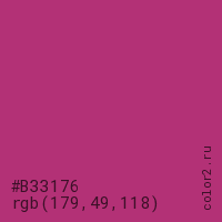 Цвет #B33176 в цветовой модели RGB обозначается тремя октетами (179, 49, 118) в десятичном формате и #B33176 в шестнадцатиричном (hex) формате, которые являются интенсивностью красного 179 (hex B3), интенсивность зелёного 49 (hex 31) и интенсивность синего 118 (hex 76).
