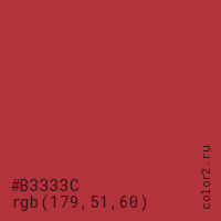 Цвет #B3333C в цветовой модели RGB обозначается тремя октетами (179, 51, 60) в десятичном формате и #B3333C в шестнадцатиричном (hex) формате, которые являются интенсивностью красного 179 (hex B3), интенсивность зелёного 51 (hex 33) и интенсивность синего 60 (hex 3C).