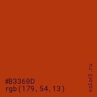 Цвет #B3360D в цветовой модели RGB обозначается тремя октетами (179, 54, 13) в десятичном формате и #B3360D в шестнадцатиричном (hex) формате, которые являются интенсивностью красного 179 (hex B3), интенсивность зелёного 54 (hex 36) и интенсивность синего 13 (hex 0D).
