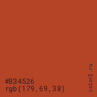 Цвет #B34526 в цветовой модели RGB обозначается тремя октетами (179, 69, 38) в десятичном формате и #B34526 в шестнадцатиричном (hex) формате, которые являются интенсивностью красного 179 (hex B3), интенсивность зелёного 69 (hex 45) и интенсивность синего 38 (hex 26).