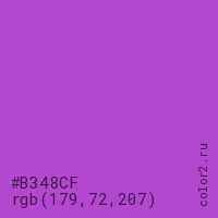 Цвет #B348CF в цветовой модели RGB обозначается тремя октетами (179, 72, 207) в десятичном формате и #B348CF в шестнадцатиричном (hex) формате, которые являются интенсивностью красного 179 (hex B3), интенсивность зелёного 72 (hex 48) и интенсивность синего 207 (hex CF).