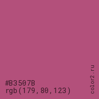Цвет #B3507B в цветовой модели RGB обозначается тремя октетами (179, 80, 123) в десятичном формате и #B3507B в шестнадцатиричном (hex) формате, которые являются интенсивностью красного 179 (hex B3), интенсивность зелёного 80 (hex 50) и интенсивность синего 123 (hex 7B).