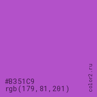 Цвет #B351C9 в цветовой модели RGB обозначается тремя октетами (179, 81, 201) в десятичном формате и #B351C9 в шестнадцатиричном (hex) формате, которые являются интенсивностью красного 179 (hex B3), интенсивность зелёного 81 (hex 51) и интенсивность синего 201 (hex C9).