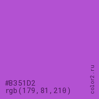 Цвет #B351D2 в цветовой модели RGB обозначается тремя октетами (179, 81, 210) в десятичном формате и #B351D2 в шестнадцатиричном (hex) формате, которые являются интенсивностью красного 179 (hex B3), интенсивность зелёного 81 (hex 51) и интенсивность синего 210 (hex D2).
