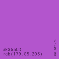 Цвет #B355CD в цветовой модели RGB обозначается тремя октетами (179, 85, 205) в десятичном формате и #B355CD в шестнадцатиричном (hex) формате, которые являются интенсивностью красного 179 (hex B3), интенсивность зелёного 85 (hex 55) и интенсивность синего 205 (hex CD).