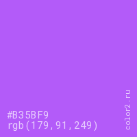 Цвет RGB(179, 91, 249) в процентом отношении количества цвета состоит из 70.2% красного (red), 35.7% зелёного (green) и 97.6% синего (blue).