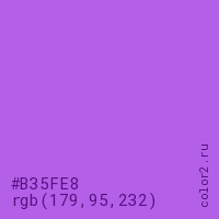 Цвет #B35FE8 в цветовой модели RGB обозначается тремя октетами (179, 95, 232) в десятичном формате и #B35FE8 в шестнадцатиричном (hex) формате, которые являются интенсивностью красного 179 (hex B3), интенсивность зелёного 95 (hex 5F) и интенсивность синего 232 (hex E8).