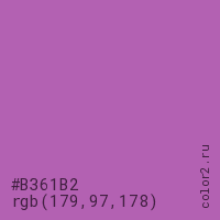 Цвет #B361B2 в цветовой модели RGB обозначается тремя октетами (179, 97, 178) в десятичном формате и #B361B2 в шестнадцатиричном (hex) формате, которые являются интенсивностью красного 179 (hex B3), интенсивность зелёного 97 (hex 61) и интенсивность синего 178 (hex B2).