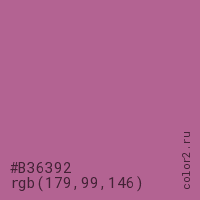 Цвет #B36392 в цветовой модели RGB обозначается тремя октетами (179, 99, 146) в десятичном формате и #B36392 в шестнадцатиричном (hex) формате, которые являются интенсивностью красного 179 (hex B3), интенсивность зелёного 99 (hex 63) и интенсивность синего 146 (hex 92).