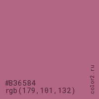 Цвет #B36584 в цветовой модели RGB обозначается тремя октетами (179, 101, 132) в десятичном формате и #B36584 в шестнадцатиричном (hex) формате, которые являются интенсивностью красного 179 (hex B3), интенсивность зелёного 101 (hex 65) и интенсивность синего 132 (hex 84).