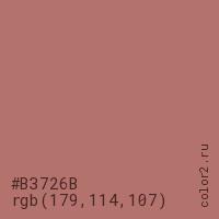 Цвет #B3726B в цветовой модели RGB обозначается тремя октетами (179, 114, 107) в десятичном формате и #B3726B в шестнадцатиричном (hex) формате, которые являются интенсивностью красного 179 (hex B3), интенсивность зелёного 114 (hex 72) и интенсивность синего 107 (hex 6B).