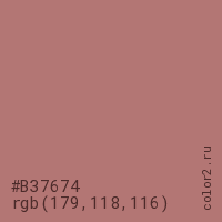 Цвет #B37674 в цветовой модели RGB обозначается тремя октетами (179, 118, 116) в десятичном формате и #B37674 в шестнадцатиричном (hex) формате, которые являются интенсивностью красного 179 (hex B3), интенсивность зелёного 118 (hex 76) и интенсивность синего 116 (hex 74).
