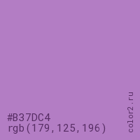 Цвет #B37DC4 в цветовой модели RGB обозначается тремя октетами (179, 125, 196) в десятичном формате и #B37DC4 в шестнадцатиричном (hex) формате, которые являются интенсивностью красного 179 (hex B3), интенсивность зелёного 125 (hex 7D) и интенсивность синего 196 (hex C4).