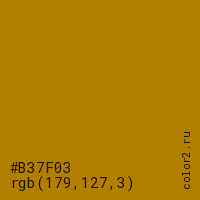 Цвет #B37F03 в цветовой модели RGB обозначается тремя октетами (179, 127, 3) в десятичном формате и #B37F03 в шестнадцатиричном (hex) формате, которые являются интенсивностью красного 179 (hex B3), интенсивность зелёного 127 (hex 7F) и интенсивность синего 3 (hex 03).