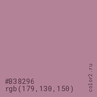 Цвет #B38296 в цветовой модели RGB обозначается тремя октетами (179, 130, 150) в десятичном формате и #B38296 в шестнадцатиричном (hex) формате, которые являются интенсивностью красного 179 (hex B3), интенсивность зелёного 130 (hex 82) и интенсивность синего 150 (hex 96).
