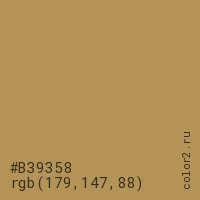 Цвет #B39358 в цветовой модели RGB обозначается тремя октетами (179, 147, 88) в десятичном формате и #B39358 в шестнадцатиричном (hex) формате, которые являются интенсивностью красного 179 (hex B3), интенсивность зелёного 147 (hex 93) и интенсивность синего 88 (hex 58).