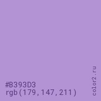 Цвет #B393D3 в цветовой модели RGB обозначается тремя октетами (179, 147, 211) в десятичном формате и #B393D3 в шестнадцатиричном (hex) формате, которые являются интенсивностью красного 179 (hex B3), интенсивность зелёного 147 (hex 93) и интенсивность синего 211 (hex D3).