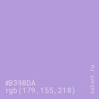 Цвет #B39BDA в цветовой модели RGB обозначается тремя октетами (179, 155, 218) в десятичном формате и #B39BDA в шестнадцатиричном (hex) формате, которые являются интенсивностью красного 179 (hex B3), интенсивность зелёного 155 (hex 9B) и интенсивность синего 218 (hex DA).