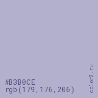 Цвет #B3B0CE в цветовой модели RGB обозначается тремя октетами (179, 176, 206) в десятичном формате и #B3B0CE в шестнадцатиричном (hex) формате, которые являются интенсивностью красного 179 (hex B3), интенсивность зелёного 176 (hex B0) и интенсивность синего 206 (hex CE).