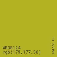 Цвет #B3B124 в цветовой модели RGB обозначается тремя октетами (179, 177, 36) в десятичном формате и #B3B124 в шестнадцатиричном (hex) формате, которые являются интенсивностью красного 179 (hex B3), интенсивность зелёного 177 (hex B1) и интенсивность синего 36 (hex 24).