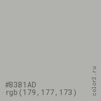 Цвет #B3B1AD в цветовой модели RGB обозначается тремя октетами (179, 177, 173) в десятичном формате и #B3B1AD в шестнадцатиричном (hex) формате, которые являются интенсивностью красного 179 (hex B3), интенсивность зелёного 177 (hex B1) и интенсивность синего 173 (hex AD).