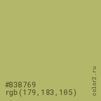 Цвет #B3B769 в цветовой модели RGB обозначается тремя октетами (179, 183, 105) в десятичном формате и #B3B769 в шестнадцатиричном (hex) формате, которые являются интенсивностью красного 179 (hex B3), интенсивность зелёного 183 (hex B7) и интенсивность синего 105 (hex 69).